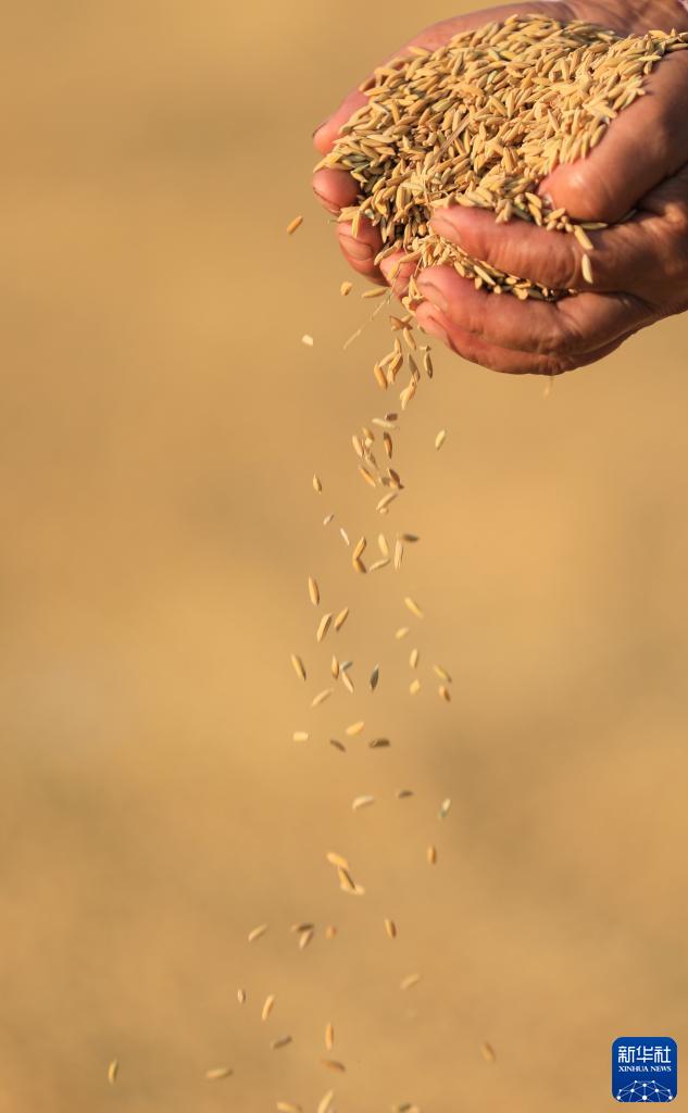 9月1日,在貴州省黔東南苗族侗族自治州從江縣剛邊壯族鄉三聯(lián)村,村民查看收割后晾曬的谷粒成色。