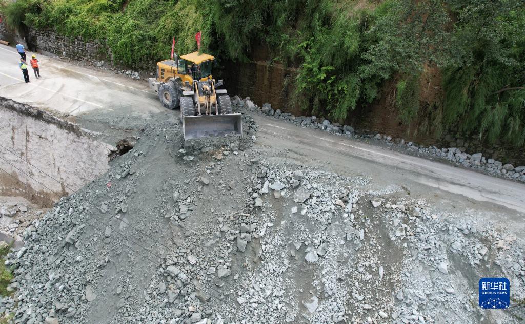 9月6日,救援人員在搶修瀘定縣城與磨西鎮之間的公路(無(wú)人機照片)。