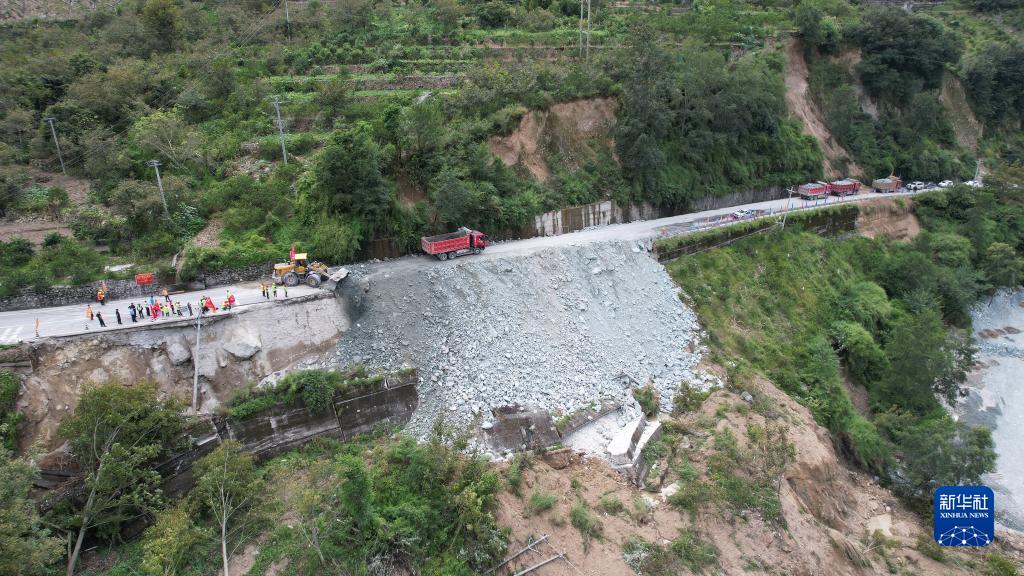 9月6日,救援人員在搶修瀘定縣城與磨西鎮之間的公路(無(wú)人機照片)。