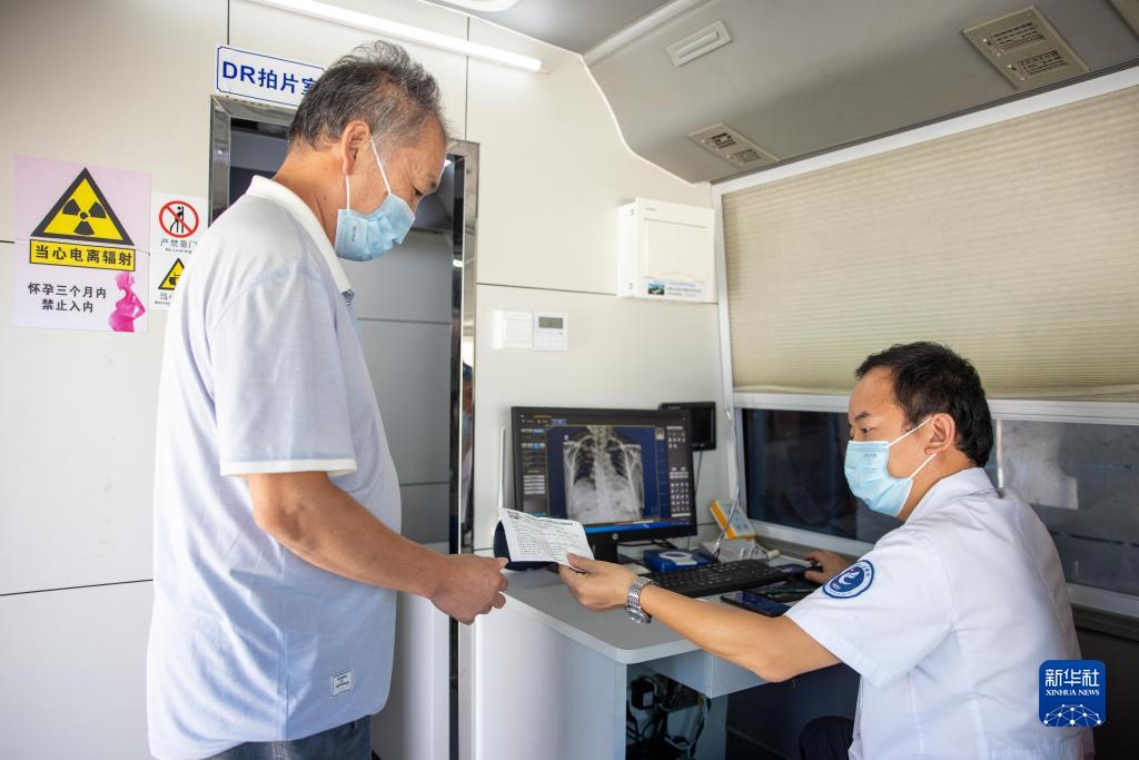 9月6日,武山村村民在巡回診療車(chē)上準備接受身體檢查。