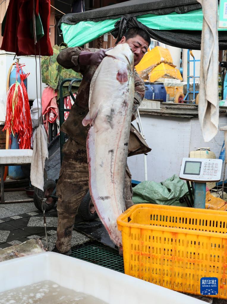 9月4日,在撫遠市東極魚(yú)市,一名魚(yú)商準備給魚(yú)稱(chēng)重。
