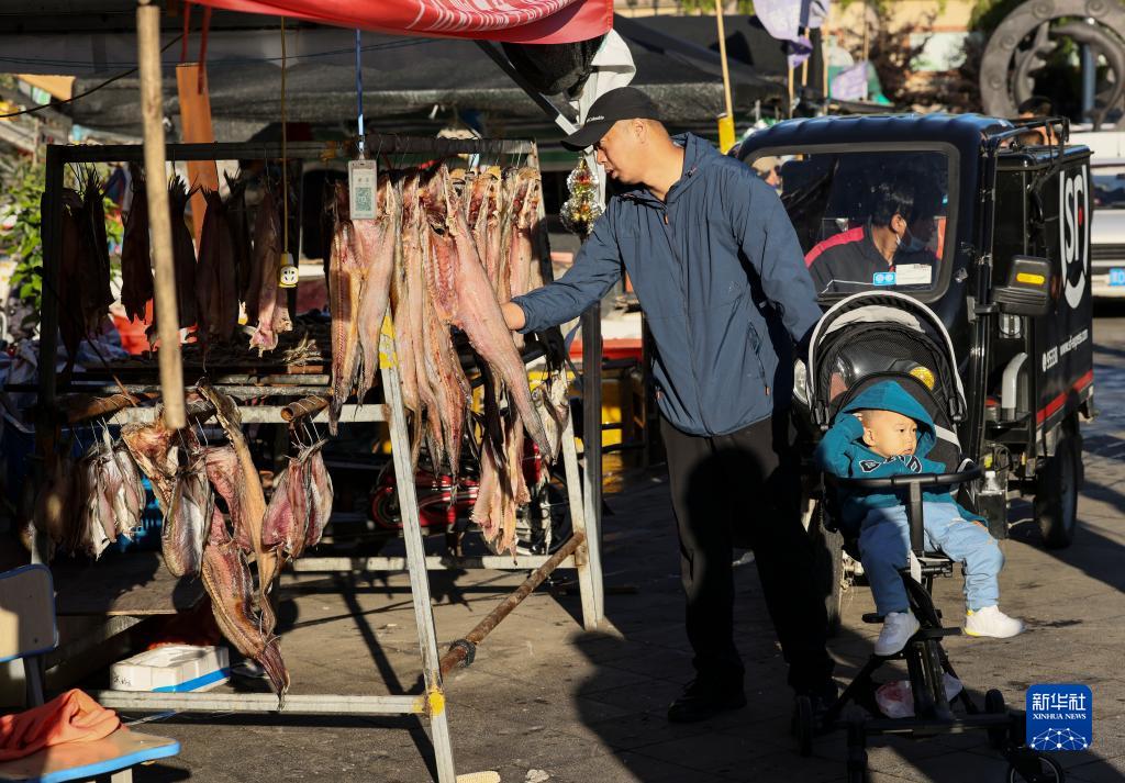 9月4日,一名市民帶著(zhù)孩子在撫遠市東極魚(yú)市選購。
