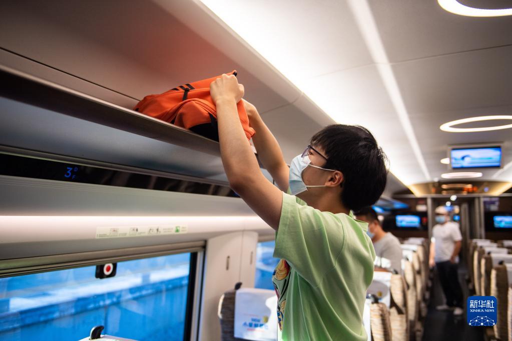 9月6日,搭乘渝廈高鐵益長(cháng)段長(cháng)沙首發(fā)G6518次列車(chē)的旅客在車(chē)廂內整理物品。