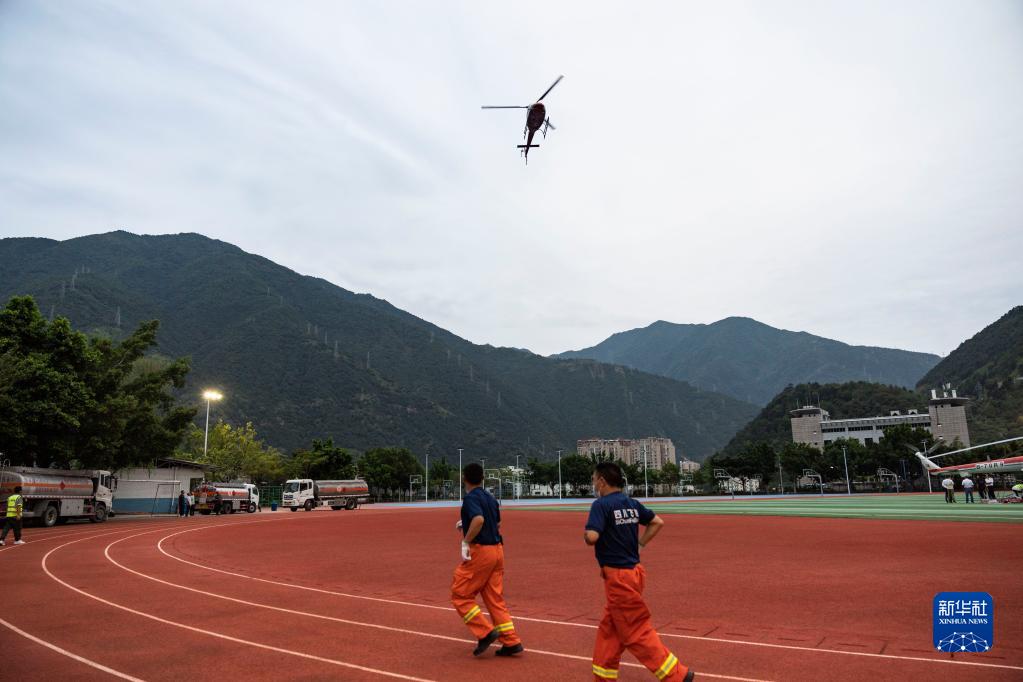 9月6日,在石棉縣中學(xué)的臨時(shí)起降點(diǎn),應急管理部南方航空護林總站救援直升機在降落。