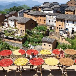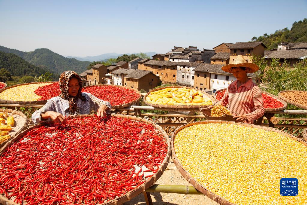 9月6日,安徽省黃山市歙縣陽(yáng)產(chǎn)村村民在曬場(chǎng)上晾曬農作物。