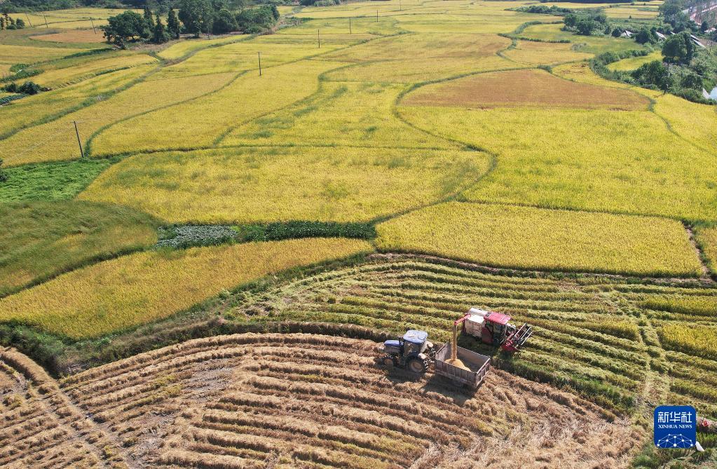 9月6日,江西省南昌市灣里管理局羅亭鎮的農戶(hù)在收割中稻(無(wú)人機照片)。