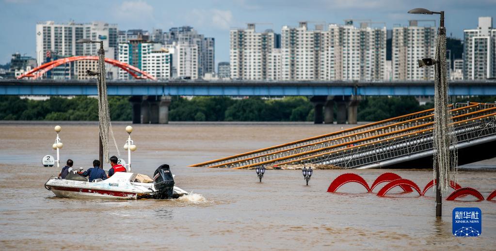 9月6日,在韓國首爾,工作人員乘快艇查看被水淹的漢江公園。