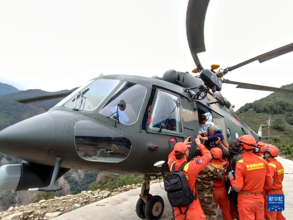 9月6日,陸軍第77集團軍某陸航旅出動(dòng)直升機在瀘定縣轉移受傷人員。新華社發(fā)(趙云橋 攝)