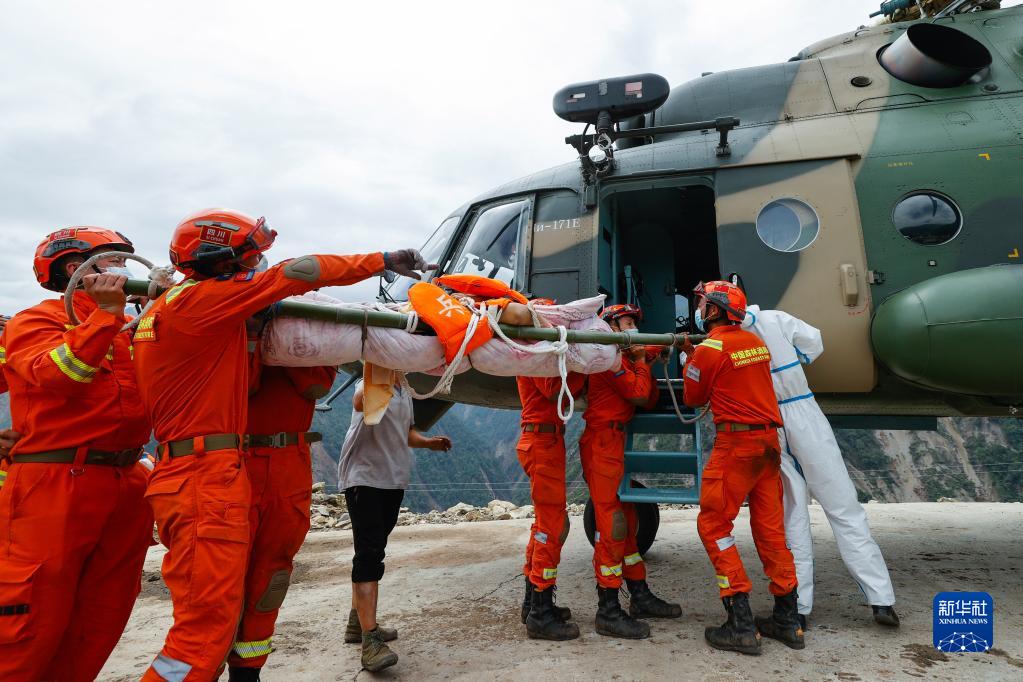 9月6日,救援人員抬著(zhù)一名從瀘定縣得妥鎮灣東村疏散出來(lái)的受傷村民,準備通過(guò)直升機將其運出。