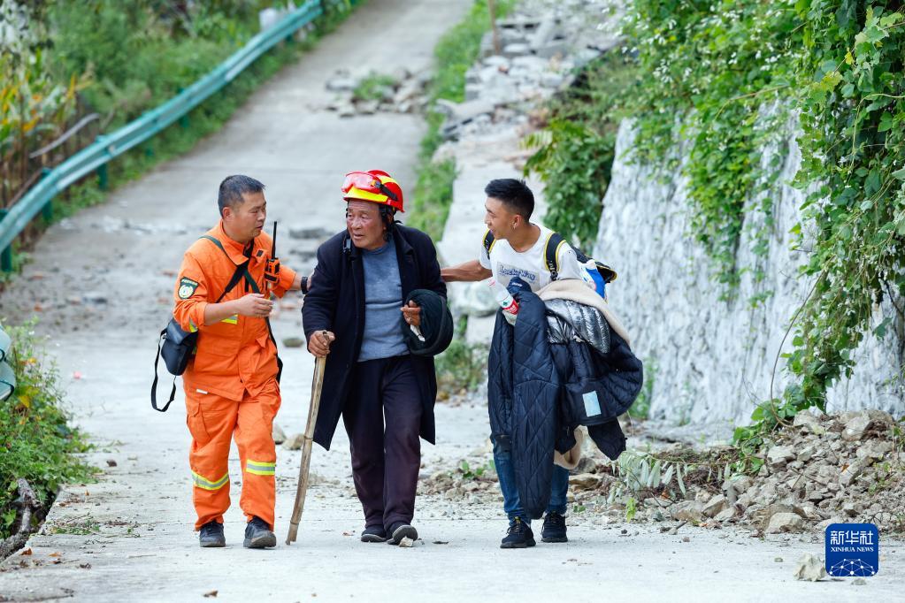 9月6日,救援人員護送從瀘定縣得妥鎮灣東村疏散出來(lái)的村民。