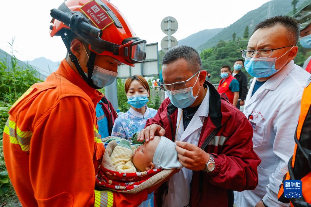 9月6日,阿壩森林消防支隊汶川大隊隊員張自立將一名從瀘定縣得妥鎮灣東村疏散出來(lái)的2個(gè)月大的嬰兒,交給瀘定縣人民醫院醫生。