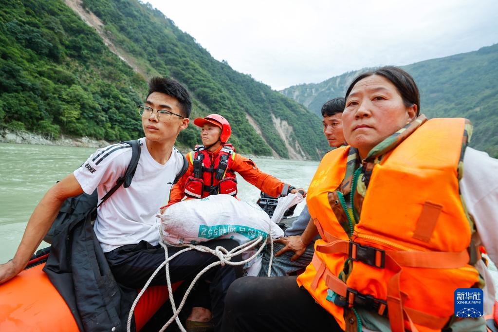 9月6日,從瀘定縣得妥鎮灣東村疏散出來(lái)的村民乘坐橡皮艇向外疏散。