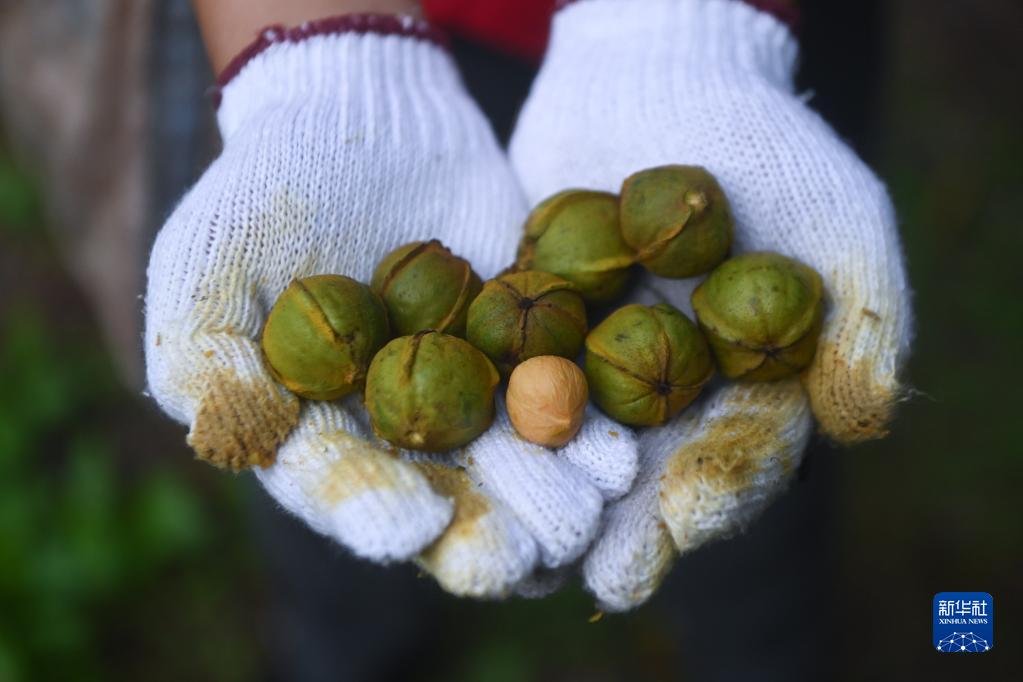 9月7日,淳安縣臨岐鎮審嶺腳村的農戶(hù)展示采收的山核桃果。