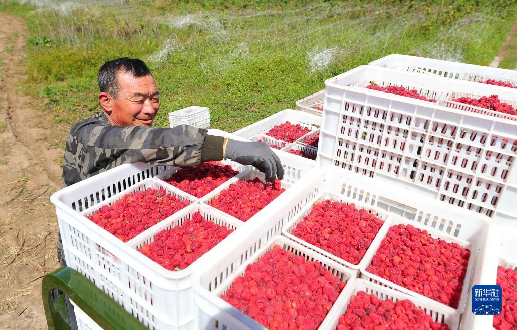 9月6日,在法庫縣登仕堡子鎮西登仕堡子村樹(shù)莓種植基地,農民準備運送樹(shù)莓。