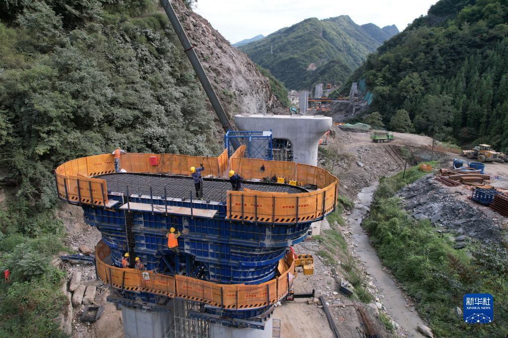 9月6日,工人在位于陜西旬陽(yáng)縣境內的一處西康高鐵建設現場(chǎng)施工(無(wú)人機照片)。