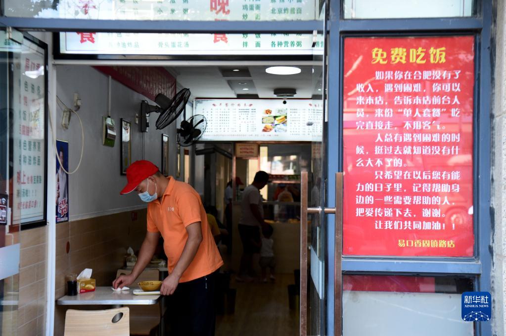 “如果你在合肥沒(méi)有收入,遇到困難,你可以來(lái)本店,告訴前臺人員來(lái)份‘單人套餐’,吃完直接走,不用客氣?!边@則暖心的告示張貼在安徽省合肥市廬陽(yáng)區固鎮路上的一家早餐店門(mén)口。