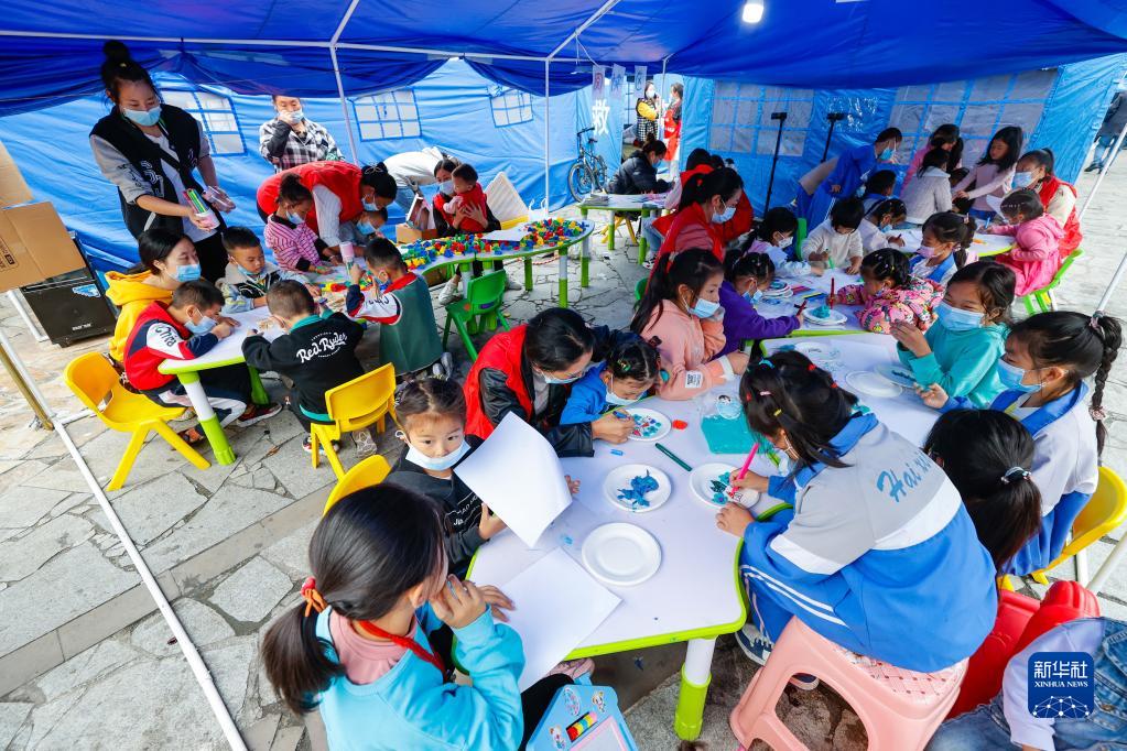 9月6日,四川省甘孜州瀘定縣磨西鎮在地震救災安置點(diǎn)里開(kāi)設了一個(gè)青青兒童樂(lè )園,通過(guò)做游戲等方式對這里的孩子進(jìn)行安撫。此后還將有更多青青兒童樂(lè )園在安置點(diǎn)里陸續設立。
