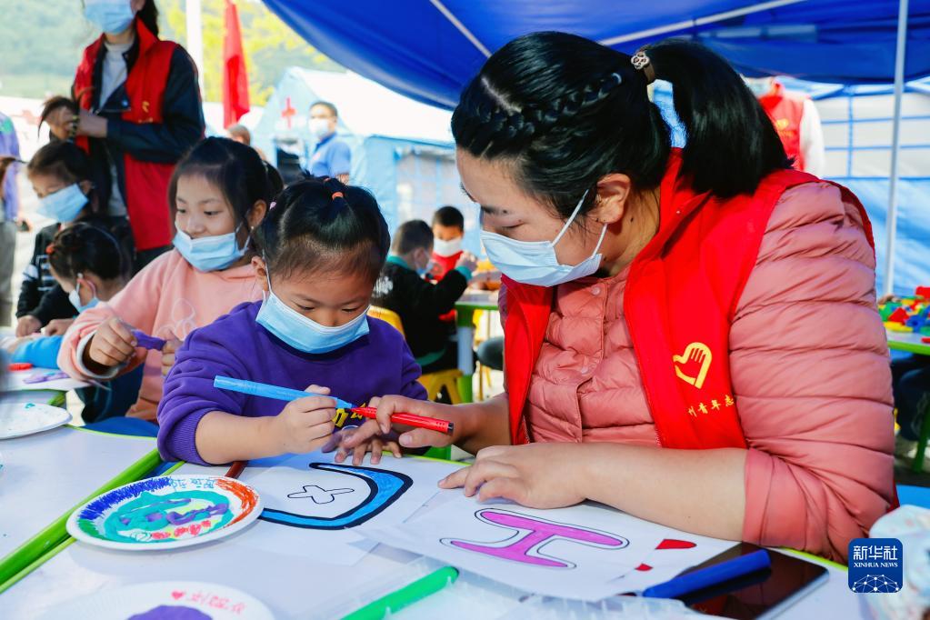 9月7日,在四川省甘孜州瀘定縣磨西鎮地震救災安置點(diǎn),志愿者陪伴孩子們在青青兒童樂(lè )園畫(huà)畫(huà)、涂色。