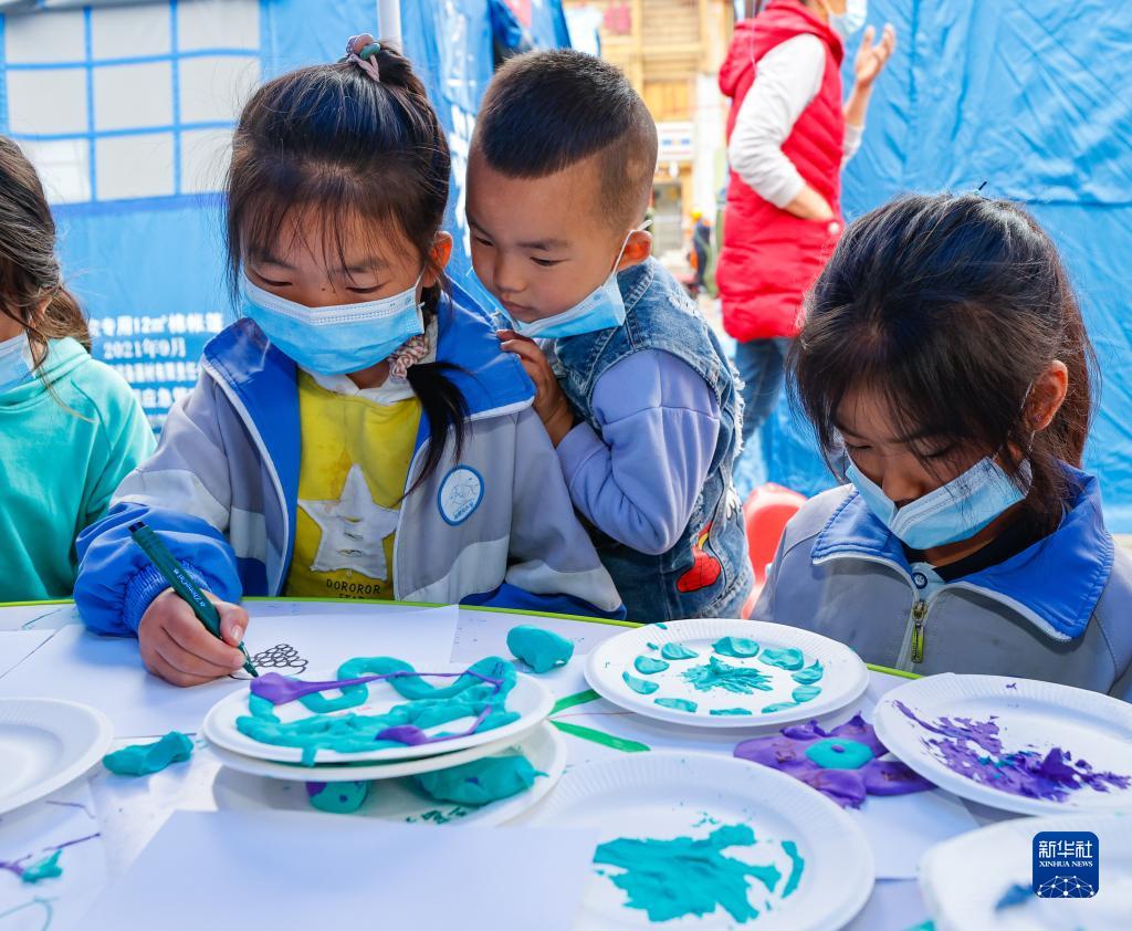 9月7日,在四川省甘孜州瀘定縣磨西鎮地震救災安置點(diǎn),孩子們在青青兒童樂(lè )園畫(huà)畫(huà)、做手工。