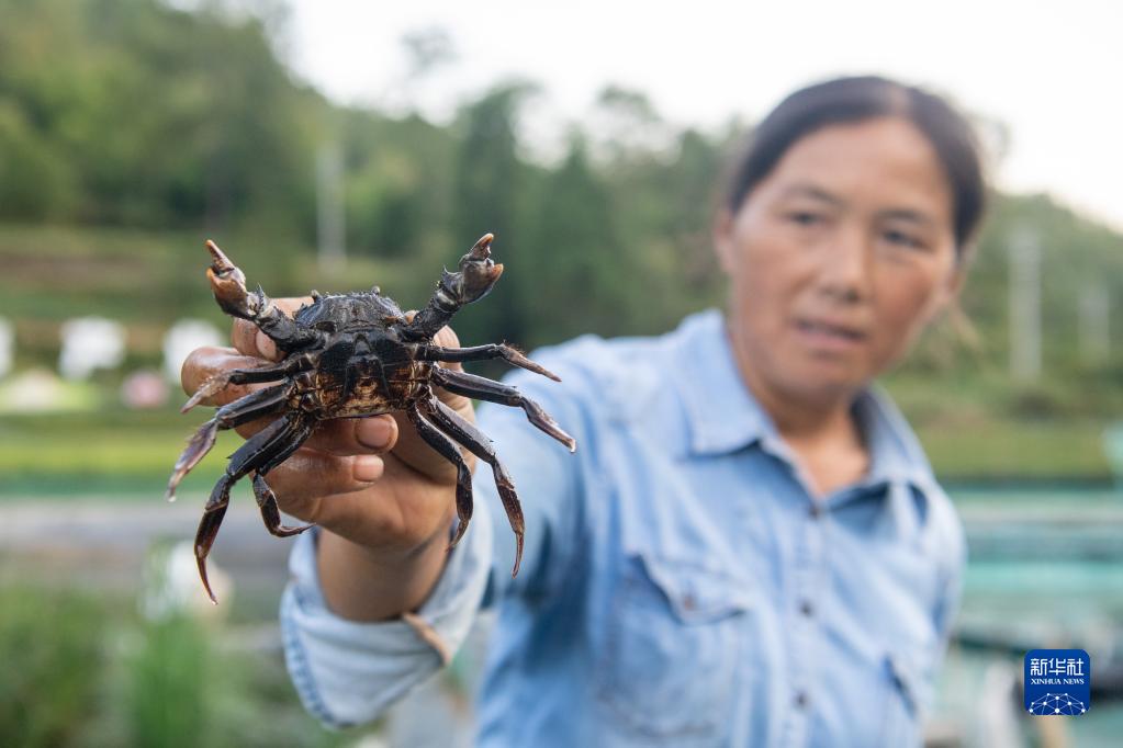 9月6日,在重慶市酉陽(yáng)縣黑水鎮大涵村“稻田養蟹產(chǎn)業(yè)園”,工作人員展示捕撈的螃蟹。這個(gè)產(chǎn)業(yè)園采取“村集體經(jīng)濟組織+企業(yè)+農戶(hù)”的發(fā)展模式,堅持“稻蟹共生、村民共富”,惠及農戶(hù)增收致富。新華社記者 唐奕 攝
