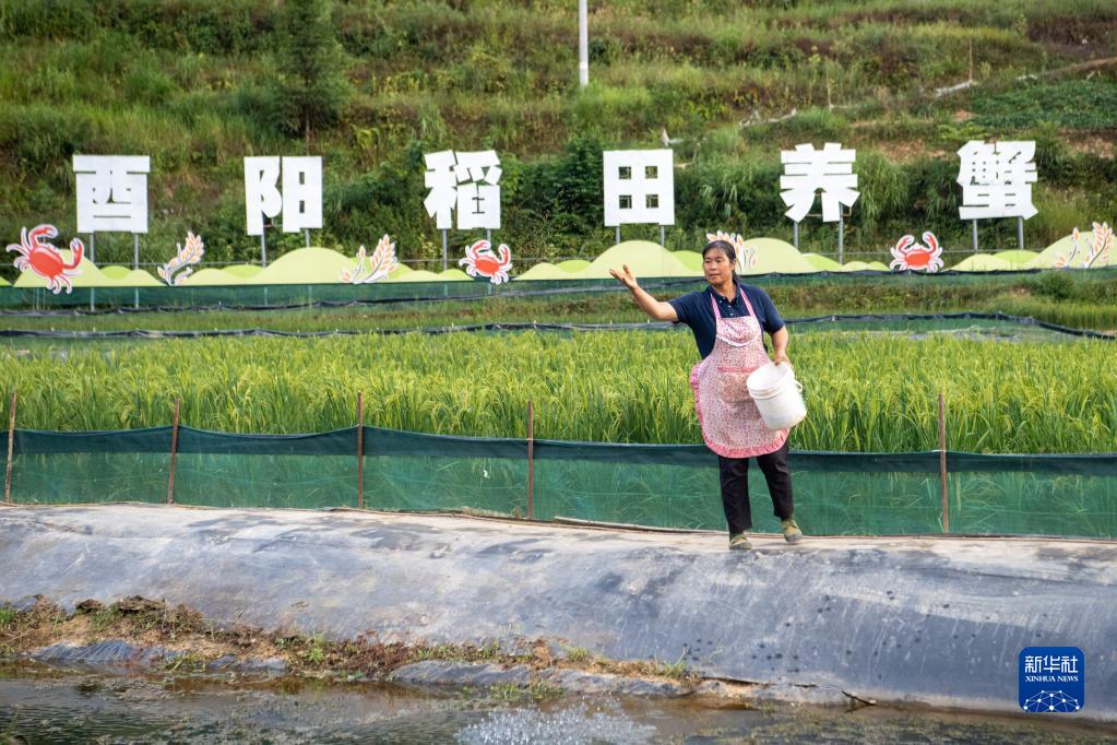 9月6日,在重慶市酉陽(yáng)縣黑水鎮大涵村“稻田養蟹產(chǎn)業(yè)園”,工作人員在拋灑飼料。新華社記者 唐奕 攝