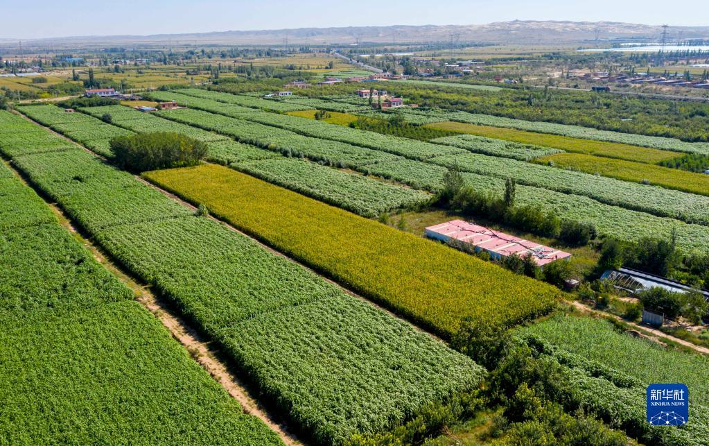 這是9月6日拍攝的寧夏靈武市郝家橋鎮團結村,綠色的部分為當地種植的巨菌草(無(wú)人機照片)。