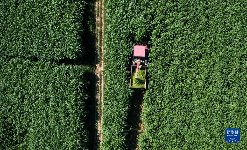 這是9月6日在寧夏靈武市郝家橋鎮團結村拍攝的巨菌草收割現場(chǎng)(無(wú)人機照片)。