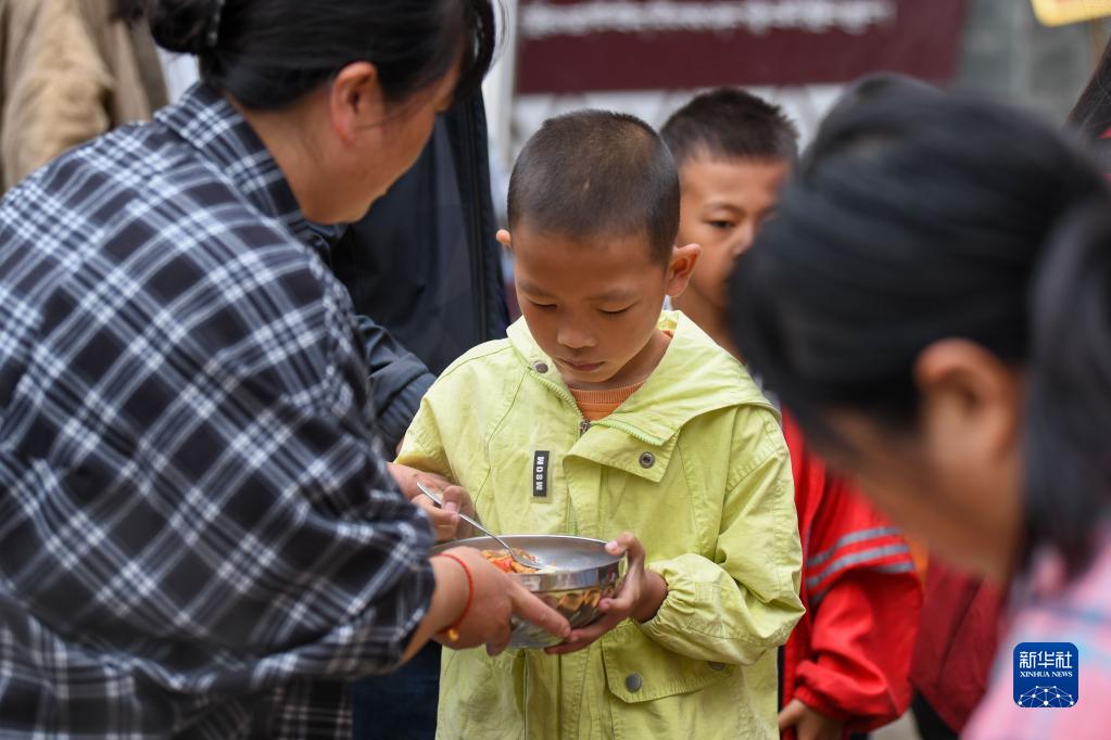 9月7日,在石棉縣草科鄉中心小學(xué),老師們組織學(xué)生有序排隊盛午飯。