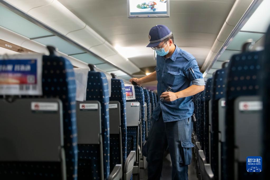 9月7日,一名工作人員在昆明動(dòng)車(chē)所內對一列動(dòng)車(chē)組列車(chē)的座椅進(jìn)行檢查。