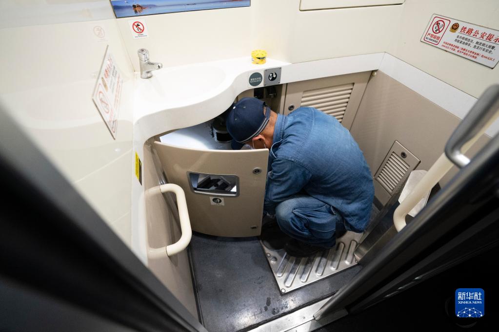 9月7日,一名工作人員在昆明動(dòng)車(chē)所內對一列動(dòng)車(chē)組列車(chē)的衛生間裝置進(jìn)行檢修。