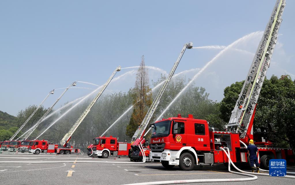 9月7日,云梯消防車(chē)在演練火場(chǎng)外圍噴水設置防止火情蔓延的水幕隔離帶。