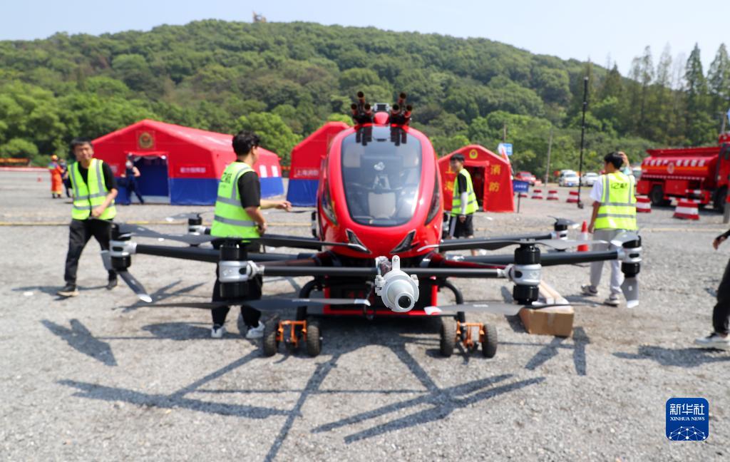 9月7日,一架裝備滅火裝置的無(wú)人機在演練現場(chǎng)進(jìn)行展示。