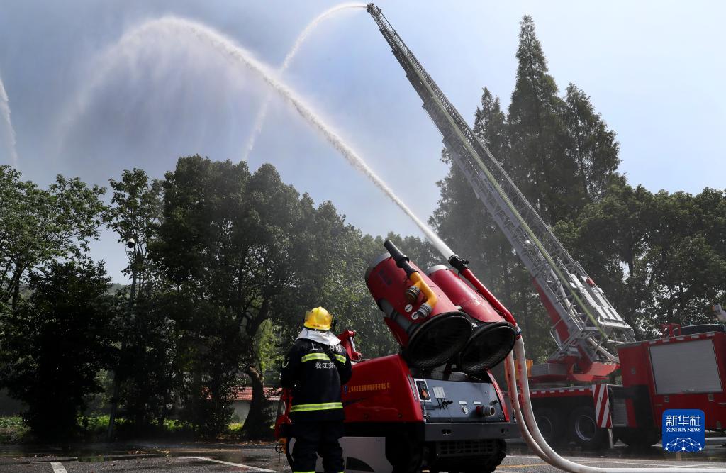 9月7日,一名消防員操控一部小型滅火車(chē)輛與云梯消防車(chē)配合,在演練火場(chǎng)外圍噴水設置防止火情蔓延的水幕隔離帶。