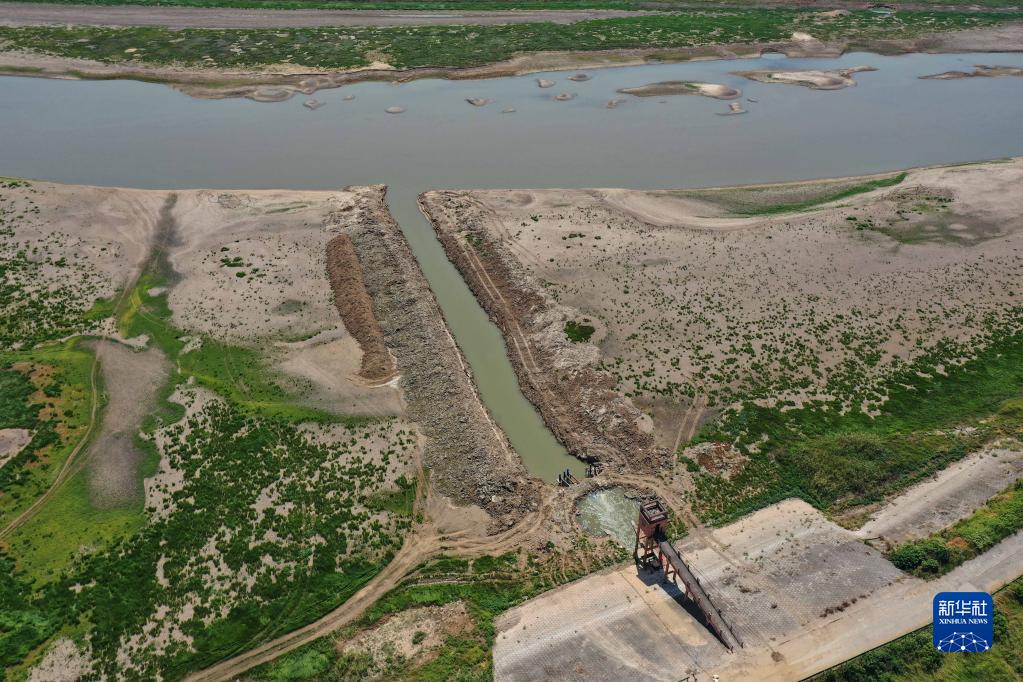 這是鄱陽(yáng)湖畔南昌市高新區鯉魚(yú)洲管理處一個(gè)電排站。為了取水,當地組織挖掘水渠深入到湖區更深處(9月7日攝,無(wú)人機照片)。
