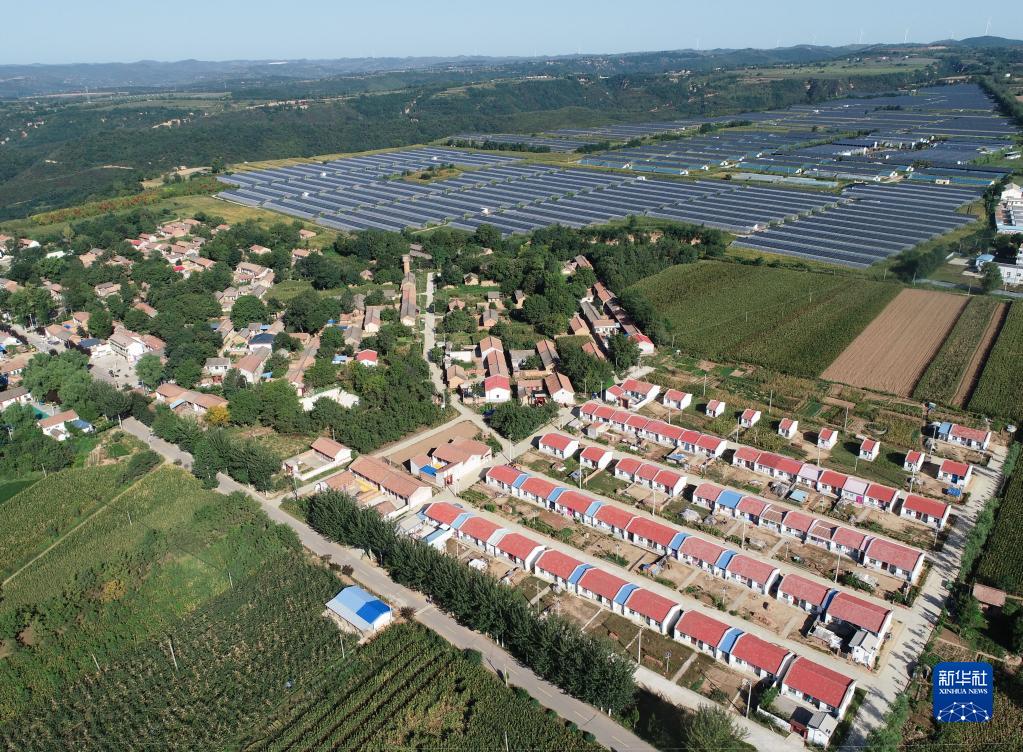 這是9月6日拍攝的麟游縣九成宮鎮豐塬村移民安置點(diǎn),不遠處的光伏農業(yè)示范園可吸納移民搬遷群眾在家門(mén)口就業(yè)(無(wú)人機照片)。