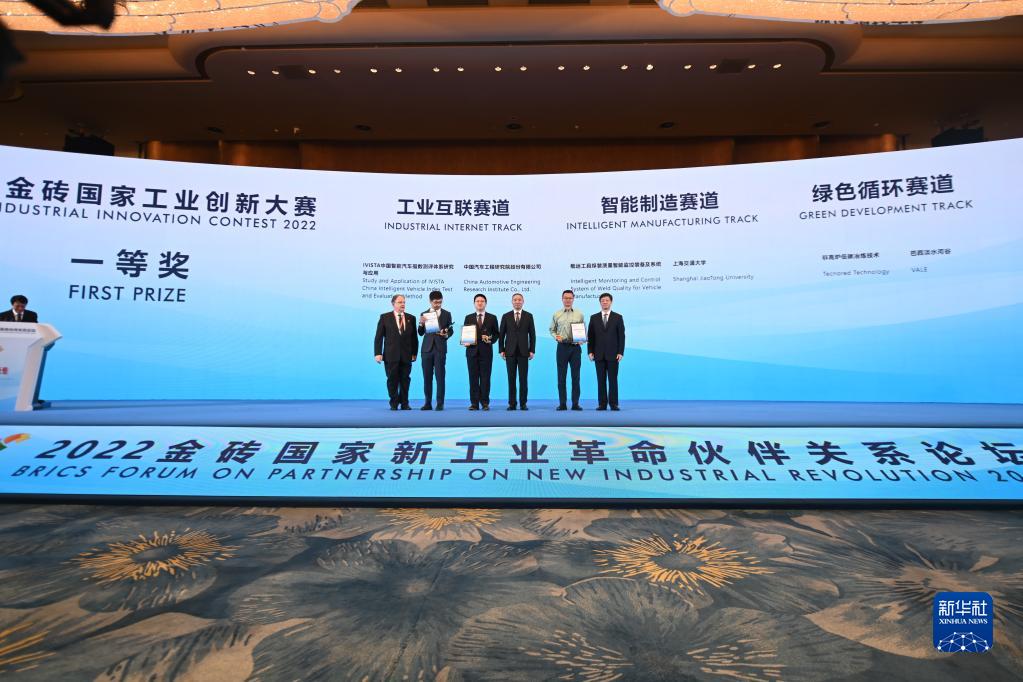 9月7日,2022金磚國家工業(yè)創(chuàng )新大賽一等獎獲得者和頒獎嘉賓合影。