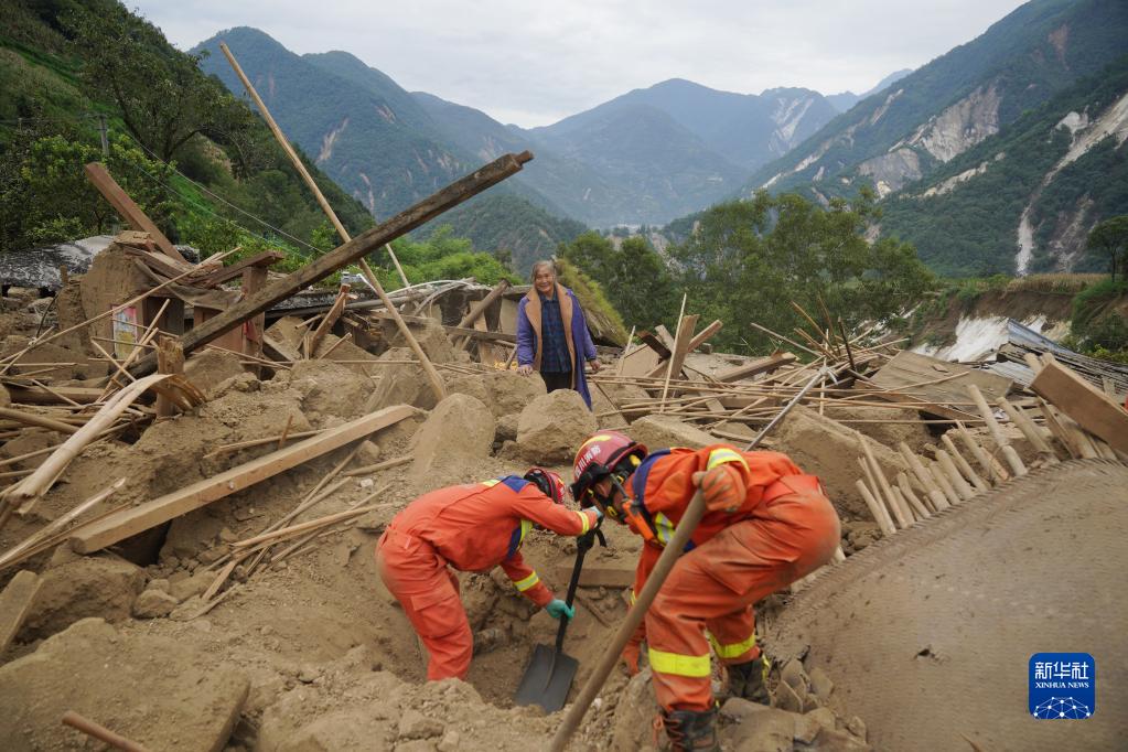 9月7日,四川眉山消防救援隊隊員在雅安市石棉縣王崗坪彝族藏族鄉幸福村二組,幫助村民在倒塌的房屋中找尋物品。