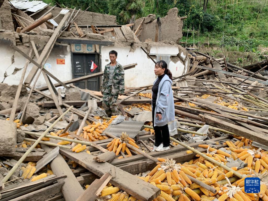 9月7日,在雅安市石棉縣王崗坪彝族藏族鄉幸福村二組,養蜜蜂為生的康貝兵(左)、陳云夫婦站在倒塌的房屋中。