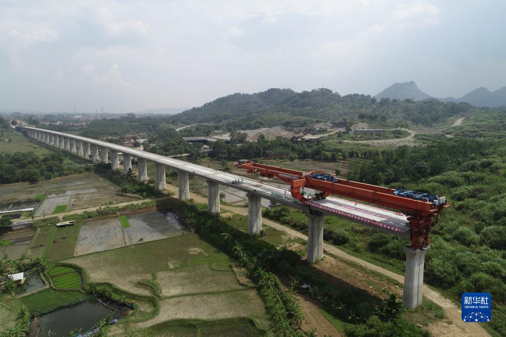 印尼雅萬(wàn)高鐵4號梁場(chǎng)最后一榀箱梁7日精準落梁對位,提前8天完成全部1066榀箱梁預制和架設任務(wù),為2023年6月建成通車(chē)奠定基礎。新華社發(fā)(王增堃 攝)