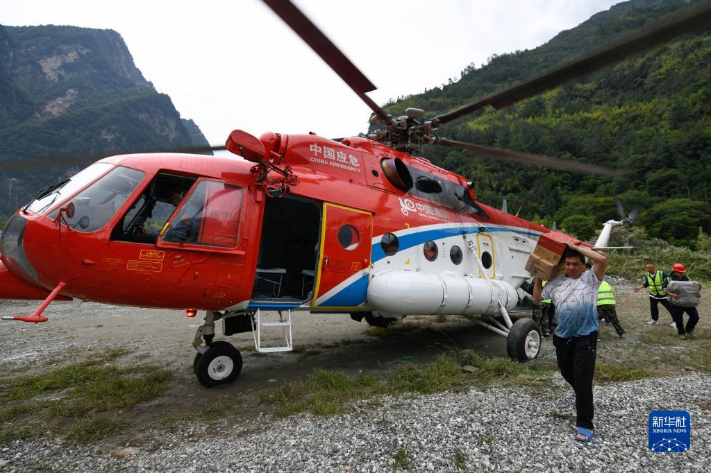 9月7日,搭載方便面和帳篷等救援物資的直升機抵達石棉縣草科鄉,當地群眾搬運物資。
