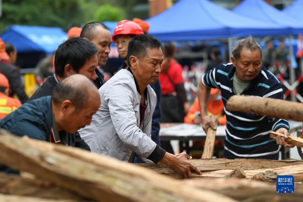 9月7日,在石棉縣草科鄉政府安置點(diǎn)內,當地群眾在搬運村民家中收集的柴火。