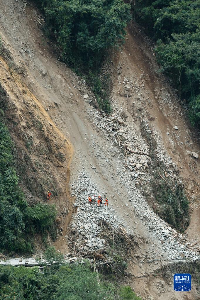9月7日,在四川省甘孜州瀘定縣磨西鎮附近,四川省成都市消防救援支隊的救援人員轉移被困群眾。
