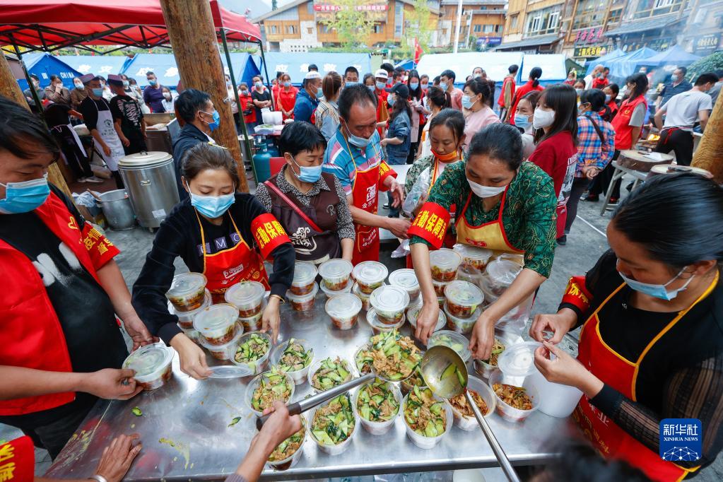 9月7日,志愿者在瀘定縣磨西鎮為人們分餐。