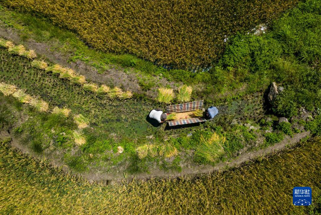 村民正在梯田中打谷脫粒(無(wú)人機照片,9月7日攝)。