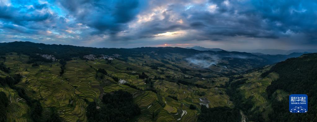 落日余暉下的哈尼梯田(無(wú)人機全景照片,9月7日攝)。