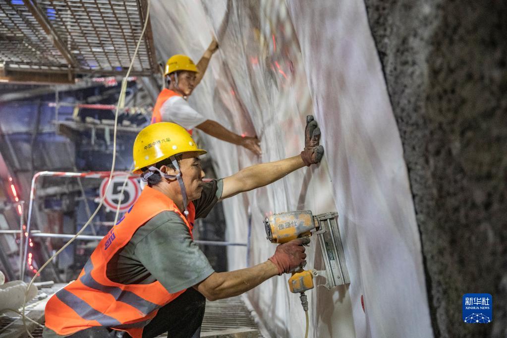 9月7日,在中鐵六局承建的武兩高速公路二標段雪峰山隧道內,工人在進(jìn)行防水作業(yè)。