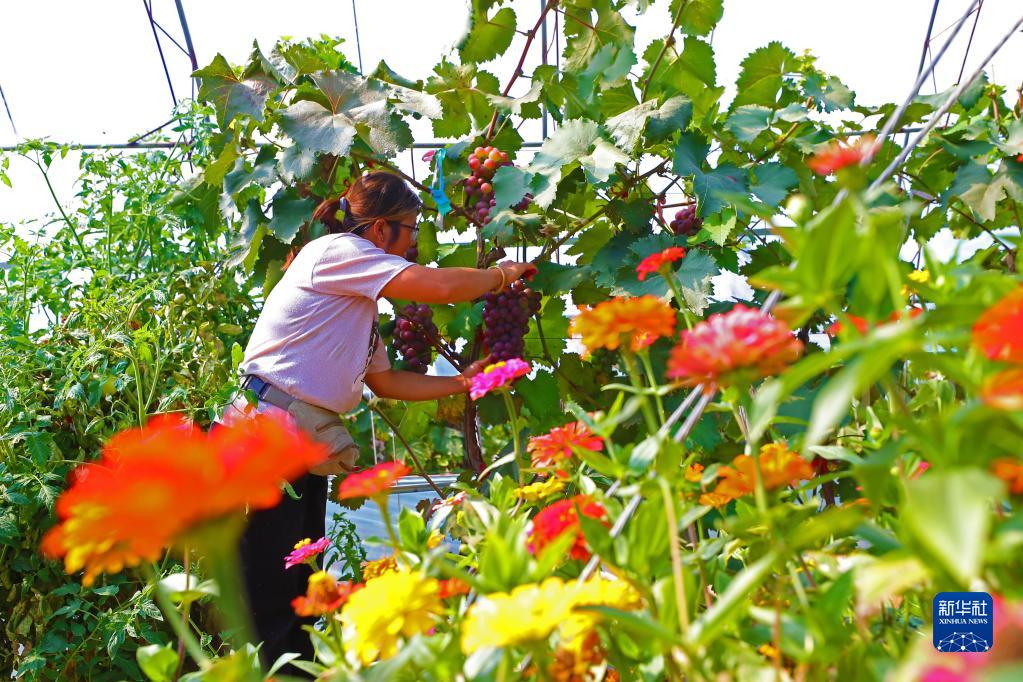 9月6日,在丁家房鎮大蛇山子村,果農在大棚里采摘葡萄。