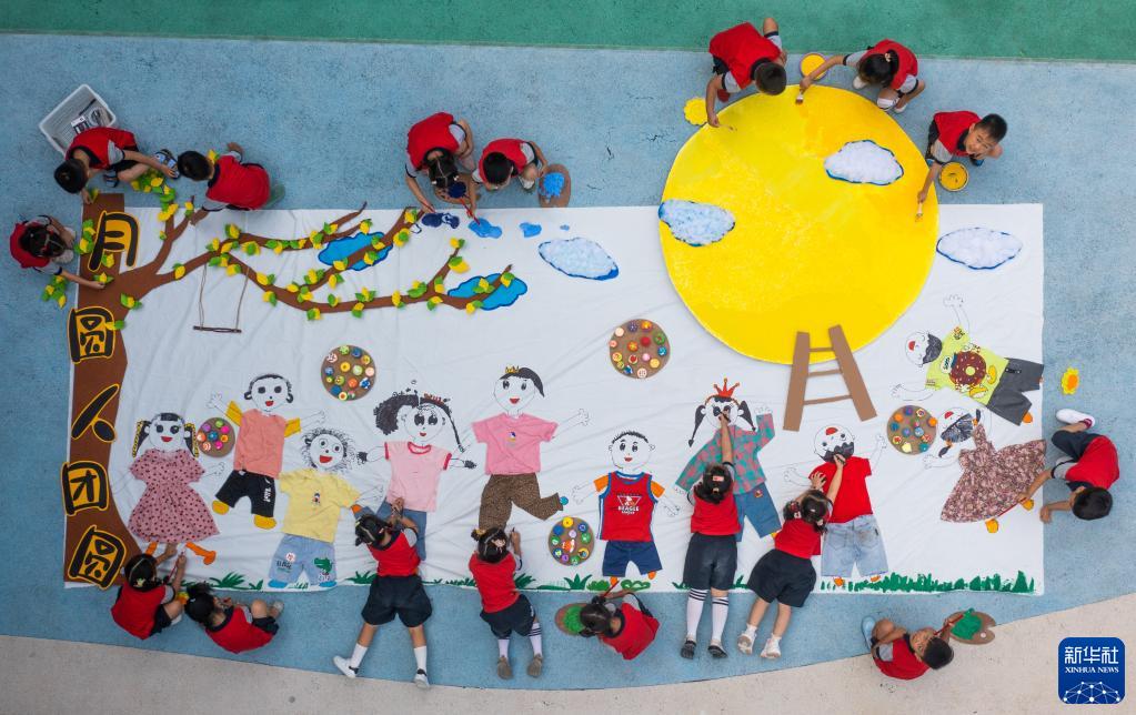 9月8日,長(cháng)橋中心幼兒園的孩子們在老師的帶領(lǐng)下用廢舊衣物等創(chuàng )作“月圓人團圓”環(huán)保創(chuàng )意畫(huà)(無(wú)人機照片)。