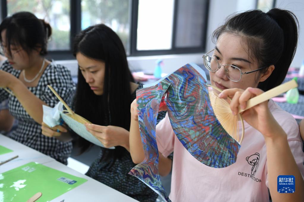 9月8日,在紙箋加工技藝傳習基地,愛(ài)好者體驗用流沙箋制作扇面。
