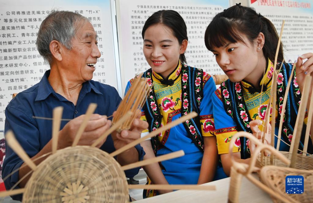 9月7日,在寧強縣羌族文化博覽園,非遺傳承人童正明(左一)在給前來(lái)學(xué)習的年輕人傳授羌編技巧。寧強縣在傳承羌編技藝的同時(shí),對傳統羌編產(chǎn)品進(jìn)行創(chuàng )新,產(chǎn)品深受消費者歡迎。